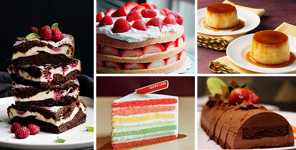 蛋糕:海绵蛋糕理论、戚风蛋糕、蓝莓芝士蛋糕、黄金蛋糕、虎皮蛋糕、杯子蛋糕等。